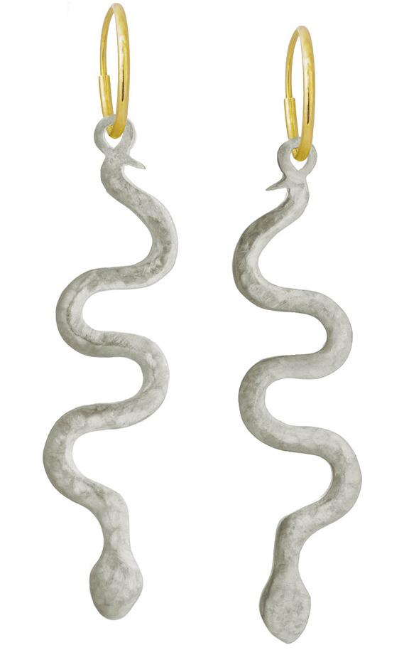 A simple primitive glyph yet delicate and modern. Our Palo Snake Earring is a lightweight, oversized design in sterling silver with minimalist lines that floats from a delicate gold endless hoop earring. Dramatic, yet a tranquil statement worn as a single earring or a matching pair.