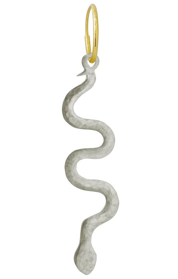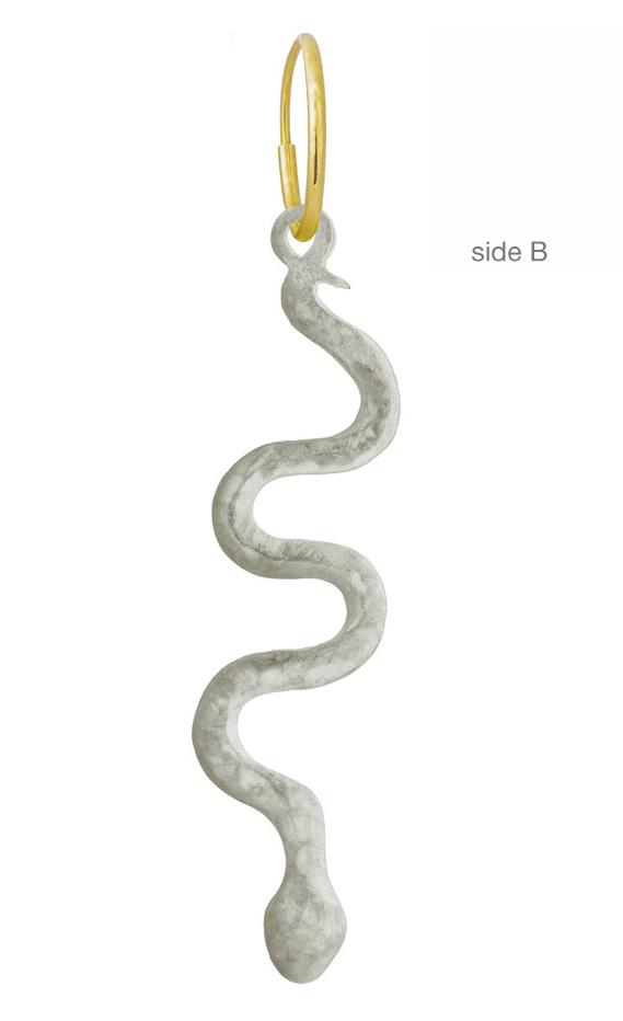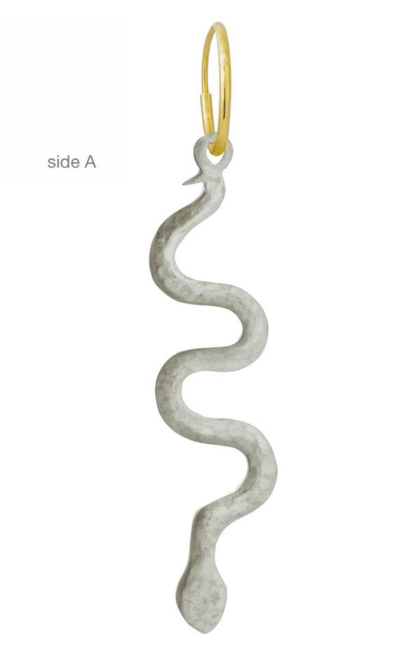 Sterling silver long snake charm dangles on a delicate 14k gold Endless Hoop