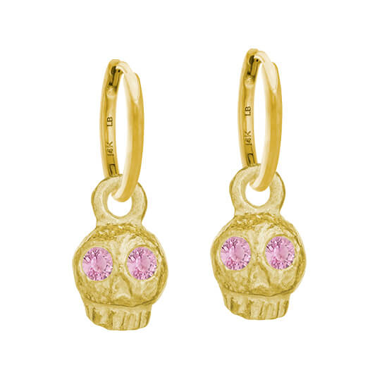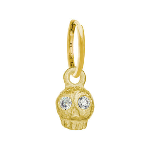 Express your rebel spirit with our Gold Jumbo Rodger Charm Earring with Stones. A 3D skull in 18k gold with diamond eyes for that mischievous glimmer. Understood as a symbol of warning, the skull was often used by ancient cultures to ward off any type of evil influence or illness. It is believed wearing skulls insures protection and well-being.