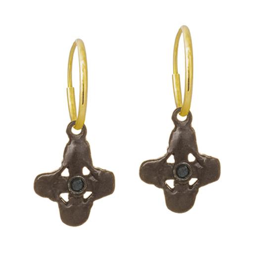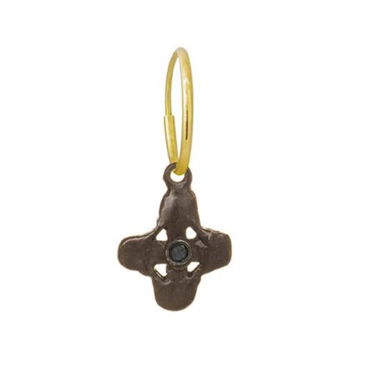 Oxidized sterling silver cross charm with a single black diamond center stone that delicately floats from a 14k Gold Endless Hoop Earring